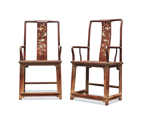 明末清初 黄花梨嵌百宝花鸟纹大南官帽椅成对。 黄花梨是我们传统家具中所使用的名贵木材,上海亦称为老花梨,广州称为降香,心材色泽由浅黄至黄色,纹理美观有香味。其在植物学上的学名称为降香黄檀,我国海南岛有此树木,当地人称为海南檀,据《广州植物志》记载:海...