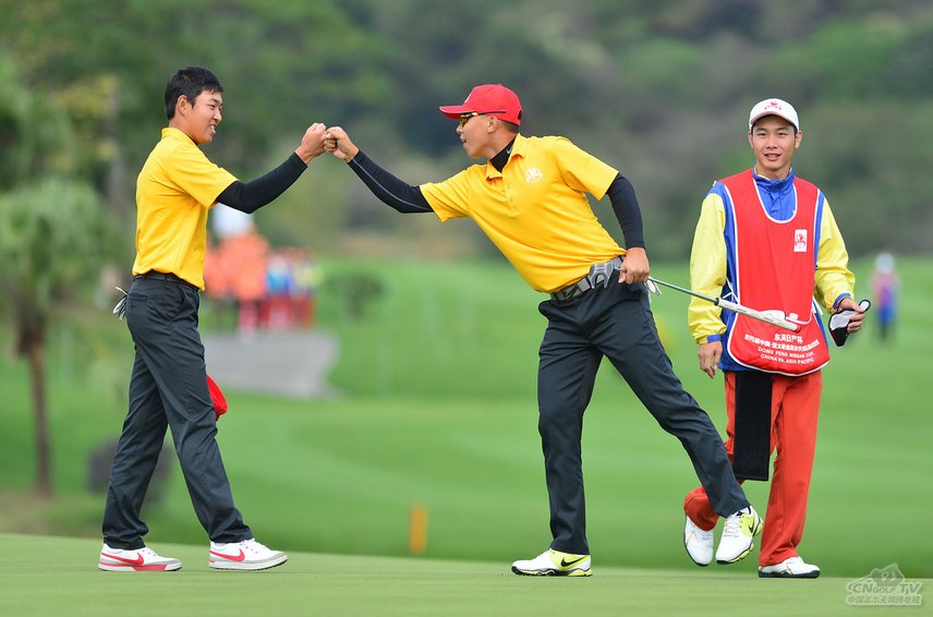 今天表现最好的中国组合是全场年龄最小的组合。珠海18岁陈子豪与北京16岁金诚搭档,赢7洞剩5洞战胜泰国名将威拉沧以及马来西亚选手许庆怀,首先为中国之队赢得1分。陈子豪从第二洞开始连续抓到3只小鸟,为全天的比赛奠定基调。当第九洞,金诚从169码之外用9号铁直接击球进洞,射下老鹰,获得4洞领先的时候,看上去这一场对决已经没有悬念。