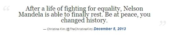 2013年12月5日 在曼德拉逝世日这天,我的思想和祷告与他的家族同在。他是我有幸会面过的最伟大的人类。