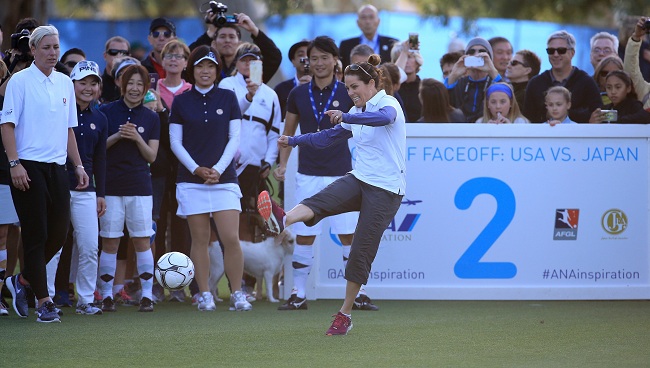 北京时间3月30日,年度首场女子大满贯全日空锦标赛开杆之前,一场美国队与日本队的足球高尔夫表演赛率先上演。美国队由两位高尔夫球手保拉.克里默、杰西卡.科达和两位美国女足国脚阿比.瓦姆巴赫和茱莉.福迪组成。日本队由高尔夫球手上原彩子、大山志保和日本女足现役国脚海堀亚由美和2011女足世界杯冠军队成员小林弥生组成,最终日本队取得胜利。