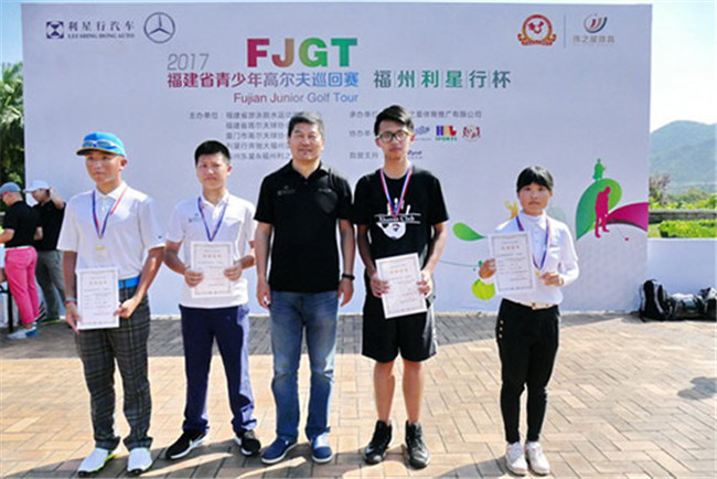 2017福建省青少年高尔夫巡回赛福州站恰逢5月14日母亲节,104位来自福建省各个地区的小选手在福州新东阳高尔夫俱乐部,参加由福州利星行冠名的比赛。在骄阳似火中ABC组男女选手完成18洞比拼,DE组男女选手完成9洞角逐,产生了男女A组冠军魏振天/潘佳琪;B组男女冠军潘子忆/杨楠;C组男女冠军任坤毓/王羽薰;D组男女冠军叶译鸿/林若芊;E组男子冠军张熙润。其中男子E组第一名张熙润与王子皓42杆并列,经过在练习果岭的切、推杆比赛,张熙润取胜王子皓赢得冠军。