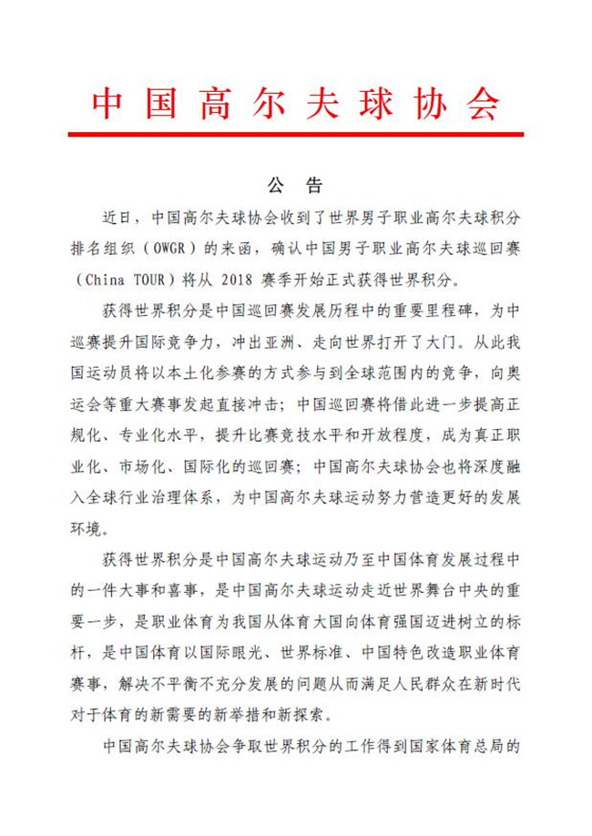 近日,中国高尔夫球协会收到了世界男子职业高尔夫球积分排名组织(OWGR)的来函,确认中国男子职业高尔夫球巡回赛(China TOUR)将从2018赛季开始正式获得世界积分。