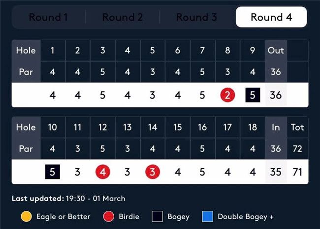 2019中巡赛奖金王马威利克·安特克利夫在决赛轮交出了本周的单轮最好成绩,4鸟2柏忌的收尾,让他以72-71-72-70总成绩-3排在并列第43位。